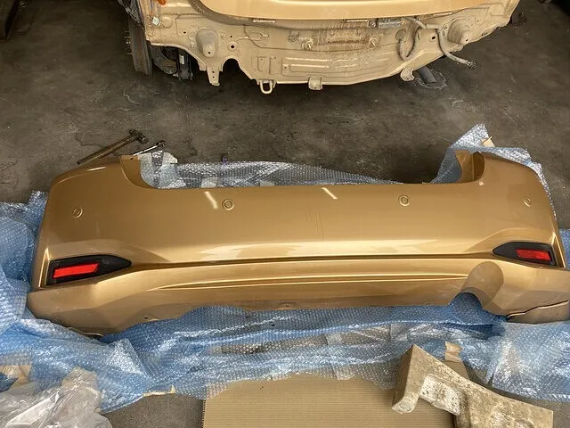 こちらのリヤバンパーは秋田県からの取り寄せ部品になります。バンパーに限らず外装部品は同じ色の部品があるかどうかが問題になります。同色部品がないと塗装費用が発生するため、修理費用が高くなります。今回は運よく同色のバンパーがありました。