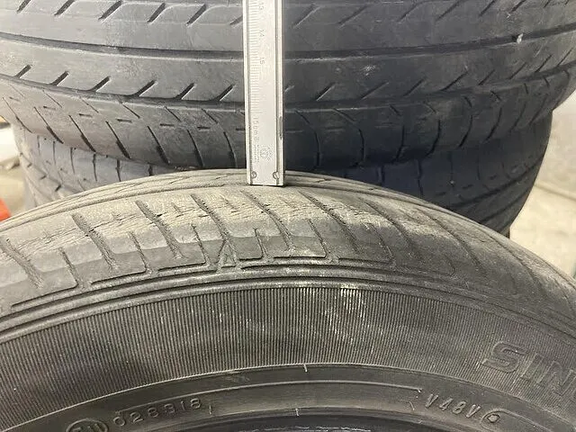 タイヤの溝深さの使用限度は乗用車で、残り溝1.6mmです。残り溝が3mmくらいになりましたら交換をお勧めいたします。