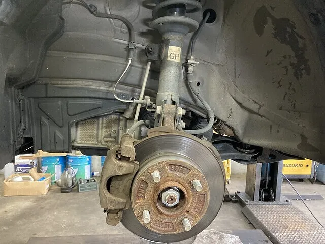 タイヤを取り外してフロントブレーキパッドの残量や動きを点検。ダストブーツ類に損傷がないか、サスペンション関係にガタや異常がないか点検していきます。
