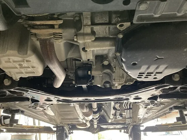 車両下回りにはブレーキ配管や燃料配管が取り付けられ、腐食や損傷がないか点検していきます。この車両にはプロペラシャフトが取り付けられており、4WDとなっております。新潟の雪道にはあると便利な装備になります。