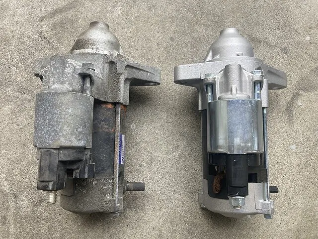 画像左側が取り外した古いスターターモーター、右側がリビルト部品となります。