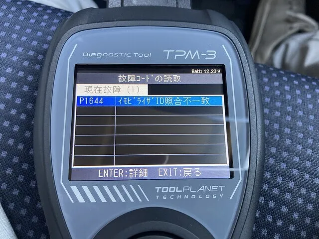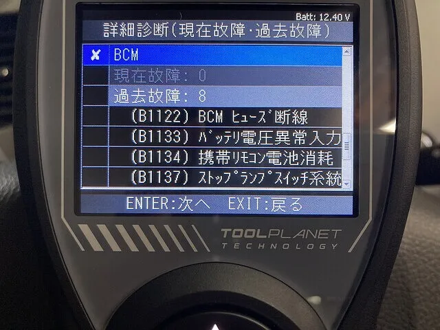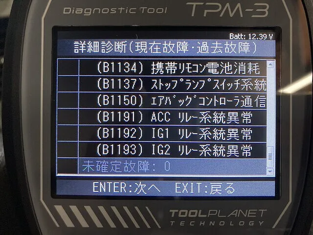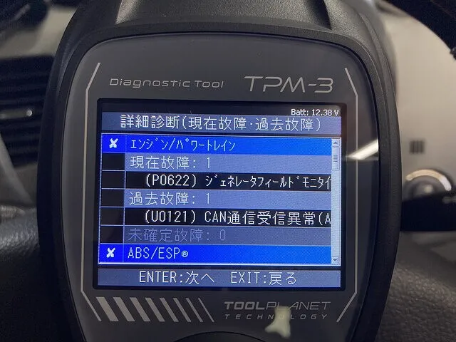 車に故障コード診断機を取り付けて故障コードの内容を確認していきます。過去故障コードを含めると10個以上の故障コードが入っていました。この中から、現在も継続していて今回の故障に関係があるか無いかを確認します。