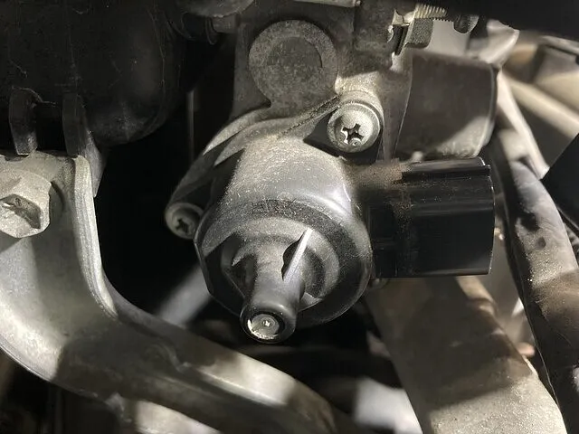 もう一つの作動音の原因、スロットルボデーの方はISCVという車がアイドリング状態のときに、空気の通路を変える弁がエンジン停止中も作動し続けており、手で触れないほど熱くなっていました。部品の点検をしても正常で、コネクタを抜いても暗電流は変わらず2~3A前後でした。